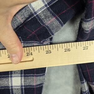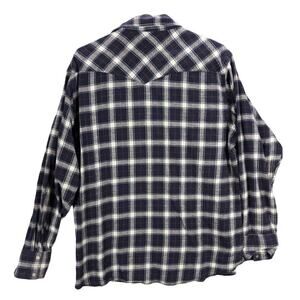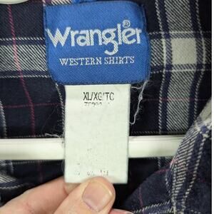 Wrangler Pearl Snap Flannel Shirt. Men's XL or Extra Large. Navy Blue and white Plaid pattern. Long Sleeve. Western, Farmer, Rancher, Country, Rodeo Style. No blemishes that I'm aware of. There is some pilling from use as expected. Washed and ready to wear. See photos for measurements and details.