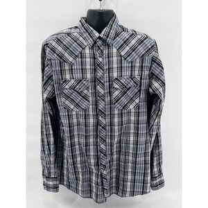 Keywords: Wrangler, western shirt, plaid shirt, long sleeve shirt, button up shirt, mens shirt, cowboy shirt, gray shirt, black shirt, casual shirt, rockabilly, western wear, menswear