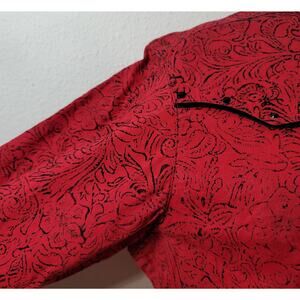 red black floral print, snap closure, pointed collar, long sleeves, rhinestones, western, lightweight, soft, the floral print feels like it is raised velvet, rounded hem