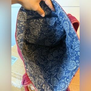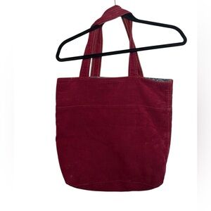 Pre owned overall excellent condition. Used a few times, inside is clean! Corduroy has minor marks from storage. Super cute red corduroy tote bag with blue paisley lining.