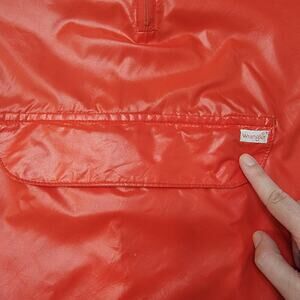 Vintage Wrangler nylon anorak in bright fire-red. Features a half-zip front, adjustable drawstring hood and hem, and logo-tagged flap pocket. Made from smooth 100 % nylon—lightweight, wind-resistant, and perfectly packable. The roomy regular fit layers easily over tees or flannels for street, outdoor, or sporty retro looks.