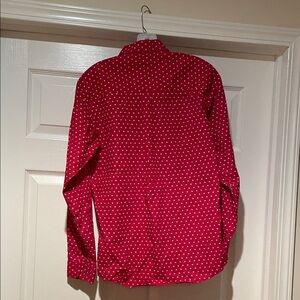Vibrant red Wrangler shirt featuring blue star patterns. Ideal for adding a pop of color to your wardrobe.