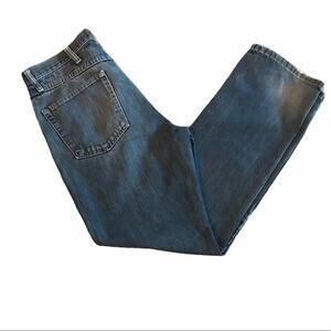 Features: Regular cut. 5 pocket construction. Button and zipper closure. Dark wash with fading at the thigh and lower back near hem.