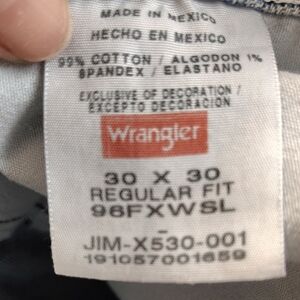 Stylish Wrangler jeans featuring a bold red label. Crafted for comfort and durability. 30x30 regular fit. sku 0018
