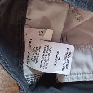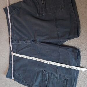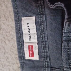 46 wrangler relaxed fit men's cargo shorts. two front side pockets, two velcro cargo pockets, two back pockets. belt loops. 98% cotton, 2% spandex. excellent pre-owned condition