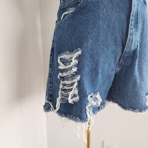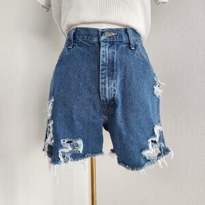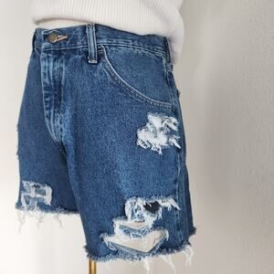 wrangler shorts vintage denim distressed ripped jean shorts high waisted y2k 90s relaxed fit raw hem grunge festival coachella cowboycore western streetwear summer staple casual everyday normcore coastal cowgirl indie oversized fit blue jean shorts closet essential