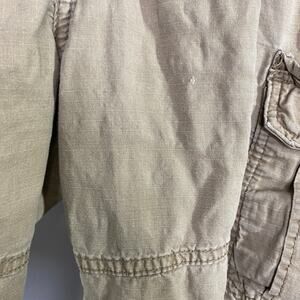 Relaxed fit khaki tan cotton blend cargo shorts. Zip fly with button closure, pockets.