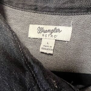 Classic black denim retro Wrangler dress Size Large Features button-up front and long sleeves. Measures 22p, 18w, and 37length.