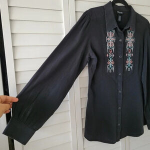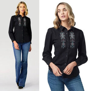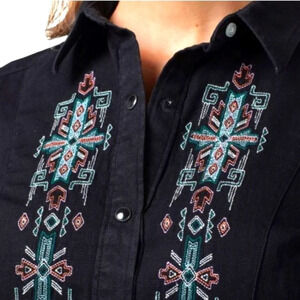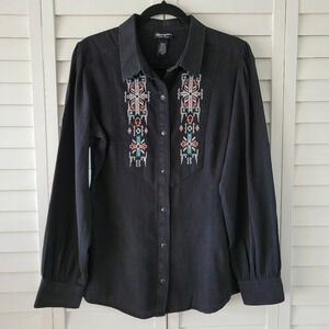 Wrangler Retro Black Denim Shirt Women's M Embroidered Western Rodeo Snap Button