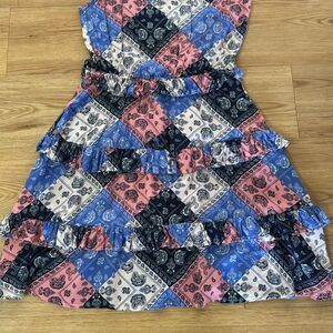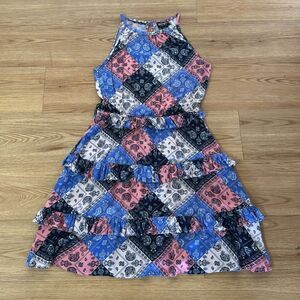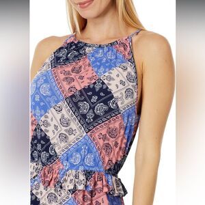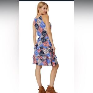 Look stunning on casual day outs with friends wearing Wrangler Goddess Neck Tiered Dress Button Closure. Regular fit. Halter neck. Button closure on the back. Ruffled detailing on waist. Tiered skirt with ruffles. Printed allover. Intended to hit at the knees. 100% rayon. Machine wash, line dry.