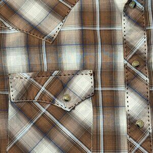 Classic Wrangler retro-inspired Western shirt featuring a bold plaid pattern in brown, tan, and blue, pearl snap closures, Western yokes, and contrast buck stitch accents.