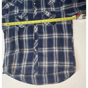 Channel rugged Americana with this Wrangler Retro Premium Western shirt in a classic indigo plaid. This medium features pearl snap buttons, flap chest pockets, and classic Western yoke detailing front and back. Made from a soft-washed cotton (fabric tag missing; likely 100% cotton based on style), it has a worn-in look with broken-in comfort.
