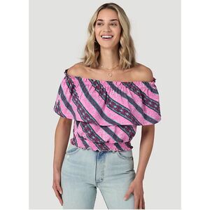Stay cool all summer long in our women's Wrangler Retro candy stripe off-the-shoulder top. Its crafted from 100% cotton for easy wearing and instant comfort. It features a cropped cut, an off-the-shoulder neckline with a fun ruffle overlay, and a smocked waistline that's flattering from every angle. This blouse features a fun striped design that looks great with everything.