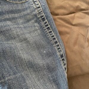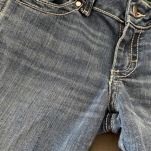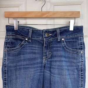These Wrangler med wash, bootcut jeans have a low rise fit and a good bit of stretch. They feature a signature, logo patch pocket as well as bling rhinestones on the back pockets. There are some stones missing as shown in photos. There are also 2 small spots, also shown in photos. Sz.3
