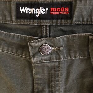 Rugged Wrangler Riggs Workwear Pants, Tough Durable Double Knee Ripstop Cargo/Carpenter Classics in Olive Green. 100% Cotton.