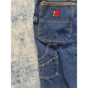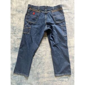 Deep blue straight leg contractor style jeans from Wrangler Riggs Workwear. Zip fly, classic 5 pocket styling with additional utility pockets on the sides of the legs. Style: 103W040AI 100% Cotton. Excellent condition.