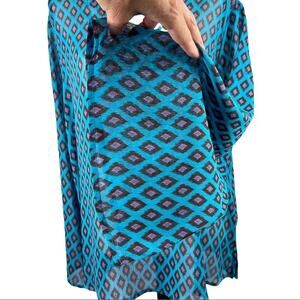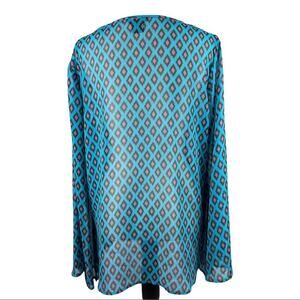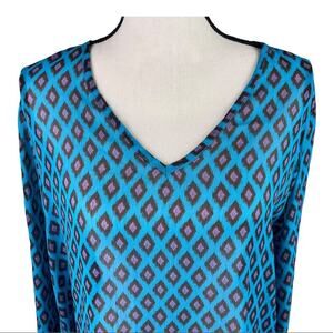 Tags: blouse top shirt lightweight semi sheer turquoise blue teal brown purple aztec western pattern vneck bell sleeve dressy casual night out everyday party church