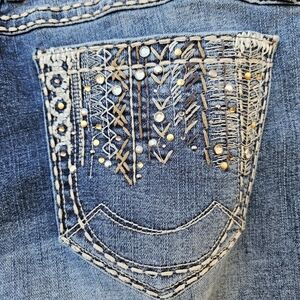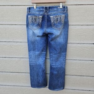 Fun statement jeans with embroidery along the pockets and side seams and rhinestones and studs on the rear pockets. Has no inner tags to indicate size, fabric content, or care instructions. Appear to have been hemmed, but it has been done evenly - see last two photos.