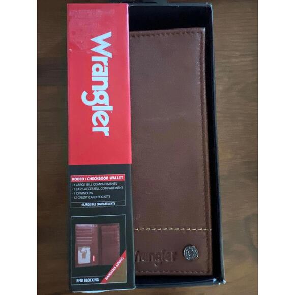 Western-inspired style meets everyday function in this Wrangler Checkbook/Rodeo Wallet. Crafted from durable leather, it features an embossed Wrangler detail and a metal denim button for a rugged, authentic touch. Spacious and practical, it keeps your essentials organized while adding a nod to classic rodeo heritage.Spot clean, lay flat to dry.