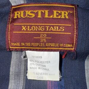 Brand and Style: It's a "Rustler X-Long Tails" shirt, a style within the broader category of men's western snap shirts, often featuring characteristics like pearl snap buttons and distinctive yokes.