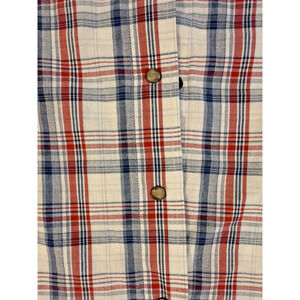Features classic red, white, and blue plaid pattern with western-style pearl snap front