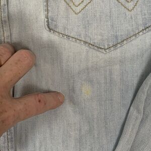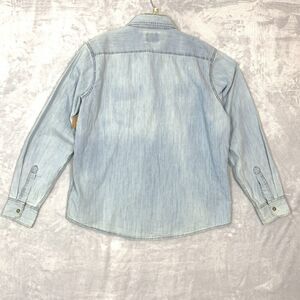 Wrangler Shirt Mens Large Blue Denim Indigo Button Up Western 90s Adult Y2K. 100% Cotton, dark pearl snap button, western stitching. In good clean condition - does have a light yellow stain in front and light spot on back upper portion of sleeve (not sure if this is just the way it was made) - see pictures. Verified measurements -