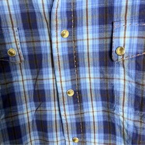 Classic Wrangler western shirt in blue plaid pattern with tan and white accents