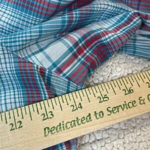This Wrangler men's XL blue and red plaid shirt is a classic piece of Western-inspired clothing, perfect for rodeos or casual everyday wear. Made from comfortable cotton fabric with a woven texture, this long-sleeve button-up features pearl snaps for a vintage touch. The shirt also includes a collared neckline, point collar style, and a regular fit, making it a versatile and stylish addition to any man's wardrobe. Perfect for all seasons, this lightweight and unlined shirt is a timeless piece with a rugged charm.