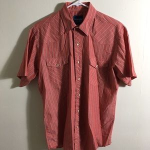 Vintage preowned wrangler short sleeve western shirt. Normal wear- Red with pin stripes. No size tag but fits like a Large More pics upon request!