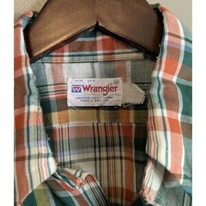 Vintage Wrangler plaid shirt from the 70's. Its very lightweight and thin. Size medium. It has 1 breast pocket. Material tag has worn off. There is a slight fabric separation under the one arm. Aside from that it's in pretty good condition for its age. It is about 28.5" long and 22" armpit to armpit. Buy with confidence. Your satisfaction is my priority. Ships fast and comes from a smoke-free home.