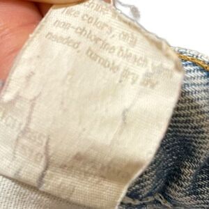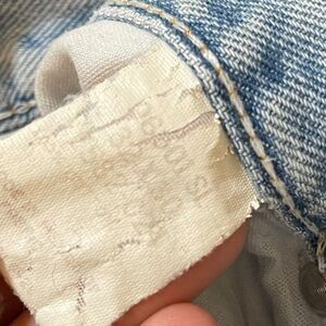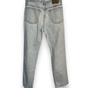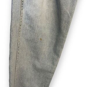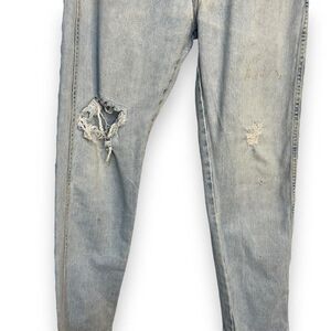 Light wash men's distressed straight-leg jeans. These jeans have pockets. There is a button and zipper closure. Good to fair overall condition. There are noticeable signs of wear on the jeans. The wear is staining and discoloration that have been pictured.