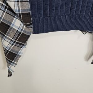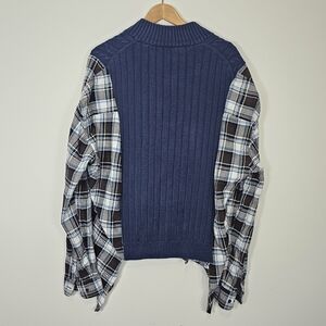 Blue cozy cableknit grandpa sweater reworked with a blue and brown flannel shirt