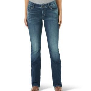 Women's Wrangler Retro Mae Mid Rise Bootcut jeans in dark wash blue denim. Style number 1009mwzpv. New with tags. Size women's 30 or juniors 9 x 36, long or tall inseam, real measurements shown in photos with jeans laid flat: