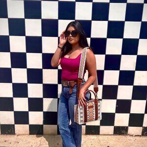 We designed an Aztec style around this tote bag. brings a unique and cool woman with your wrangler jeans.