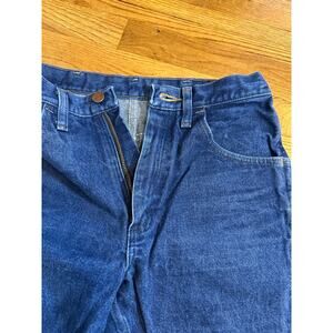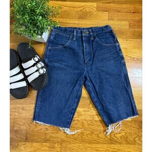 Wrangler Upcycled Cut Off Bermuda Long Cotton Frayed Jean Denim Shorts Size 30. These are a DIY upcycled pair of Wrangler cut off shorts. 5 pocket design. Zipper fly. Raw hemline. Rigid cotton fabric. Dark wash with some light signs of the fabric being broken in, including light spots and light distressing.