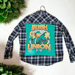 Upcycled with a Big patch on the back ( sewn) . Very warm and thick flannel. This can be worn by female and male