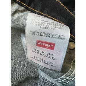 Very dark blue denim jeans from Wrangler. Relaxed fit, straight leg, zip fly, classic 5 pocket styling. Wrangler signature logo patch on back waistband. Great condition. Style 97FXWXD