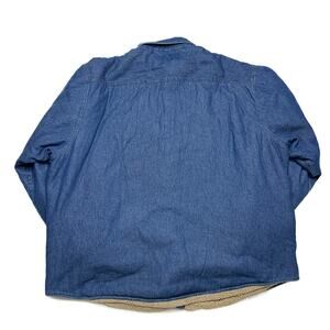 Blue medium wash denim shirt jacket with tan colored sherpa lining. Long sleeves, collared, two front chest pockets. Button closure. Vintage 1990s.