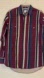 Colorful striped Western shirt by Wrangler. Features red, blue, and white stripes. Classic pearl snap design.
