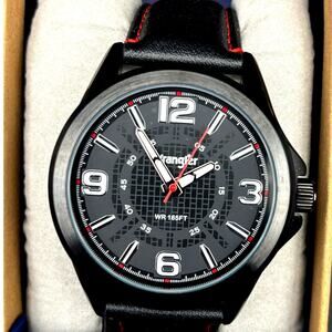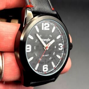 This Wrangler WRW2400-1A men’s analog watch delivers a rugged everyday style with a bold black patterned dial, silver-tone numerals, and red-accented second hand. The black ion-plated case pairs with a genuine black leather strap stitched in red for a clean, sporty look. Powered by a reliable Japan quartz movement and water resistant to 165 ft (50 meters), it’s built for daily wear. Features include a stainless steel caseback, durable mineral crystal, and comfortable stitched leather band.