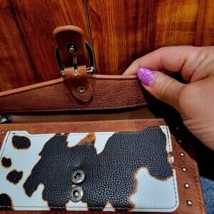 The Wrangler Western Cow-Print Tri-fold RFID Wallet/Wristlet is a stylish and functional accessory for women. Made of faux leather with a cow print pattern, this small crossbody wallet features a zipper closure and a detachable wristlet strap in brown. The wallet includes multiple credit card slots and RFID blocking technology to keep your personal information secure. Handmade with a western, bohemian, and cowboy theme, this wallet is perfect for those who appreciate unique and trendy accessories.
