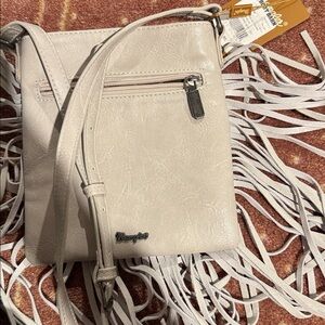 Stylish crossbody bag with fringe details and a denim accent. Perfect for casual outings.