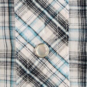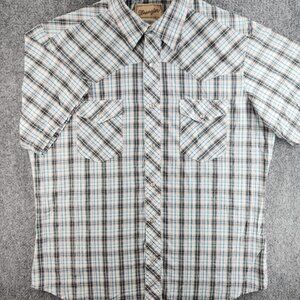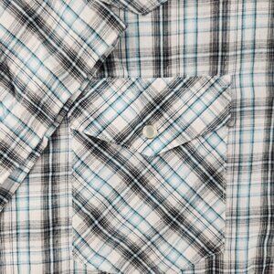 Wrangler Western Pearl Snap Shirt Short Sleeve Shiny Blue Gray Plaid Large Woven