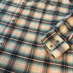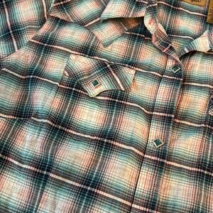 Wrangler Western Plaid Blue Pink Tan Black Snap Button Front Shirt size medium super cute play blue snap diamond square buttons great condition measurements in photos Always open to offers bundle and save more! Always fast shipping! Western Cowgirl Casual Plaid Fall Outdoor