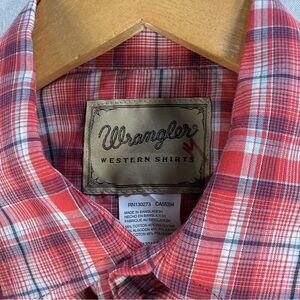 Classic Wrangler Western short sleeve shirt featuring a bold red plaid pattern and signature pearl snap buttons. Designed with double chest flap pockets and a pointed yoke front and back for that authentic cowboy look.