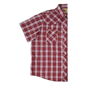 This stylish Western-inspired men's shirt from Wrangler features a classic red, blue, and white plaid pattern with short sleeves and a collared neckline with button-up pearl snap details.
