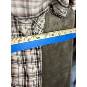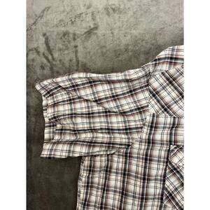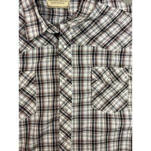 Add a touch of cowboy style to your wardrobe with this Wrangler Western Shirt in size 3XL. The shirt features a plaid pattern with brown hues and a collared neckline with a point collar style. The long sleeves come with a snap closure for ease of wear. Perfect for casual or workwear occasions, this shirt is made of a comfortable blend of silk and cotton with a woven fabric type. It also has a regular fit and is suitable for all seasons, making it a versatile addition to any wardrobe. The shirt is in excellent condition and has been crafted by the renowned western wear brand, Wrangler.