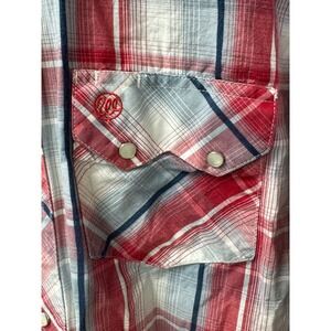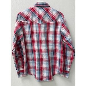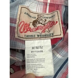 Keywords: Wrangler, Western shirt, plaid shirt, cowboy shirt, rodeo shirt, pearl snap front shirt, mens shirt, long sleeve shirt, casual shirt, red plaid, blue plaid, medium shirt, button down shirt, country shirt, American cowboys