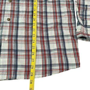 This Wrangler Western Shirt in size large features a vibrant red and blue plaid pattern, perfect for any cowboy or rancher. With pearl snap closures, this shirt offers a classic, rugged style.