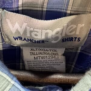 The Wrangler Western Shirt for men in size XLT features a blue plaid pattern with a pearl snap closure. This short sleeve button-up shirt is made of comfortable cotton material and is designed for casual occasions. With a collared neckline and Western theme, this shirt is suitable for all seasons and includes convenient pockets. The Wrangler brand ensures quality and style for the big and tall department. Made in Bangladesh, this shirt is perfect for summer, fall, and spring wear.